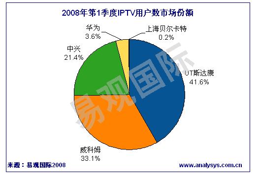《2008年第1季度中國IPTV市場季度監(jiān)測》數(shù)據(jù)顯示,2008年第1季度中國IPTV累計用戶數(shù)達131萬人。根據(jù)各廠商中標業(yè)務(wù)區(qū)實際發(fā)展的用戶數(shù)排名,UT斯達康、威科姆、中興通訊位居前三。2008年第1季度IPTV廠商的競爭格局沒有顯著變化。