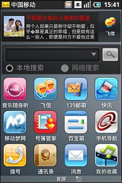 在第一屏的上端,是中國(guó)移動(dòng)的“快訊”欄目條和飛信登錄框,這讓整個(gè)手機(jī)看上去極具“中國(guó)移動(dòng)特色”,“快訊”和“飛信”的下面是Google的搜索框,搜索框有兩個(gè)選擇,分別是本地搜索和網(wǎng)路搜索。