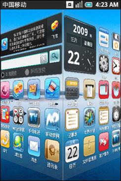由于OMS是在基于Linux的Andriod系統(tǒng)基礎(chǔ)上,針對(duì)中國(guó)市場(chǎng)需求以及中國(guó)移動(dòng)的自有業(yè)務(wù)所做的修改,OMS操作系統(tǒng)看上去第一直觀感受仍然是與iPhone界面和T-Mobile推出的第一款A(yù)ndriod手機(jī)“Gphone”界面非常相似。