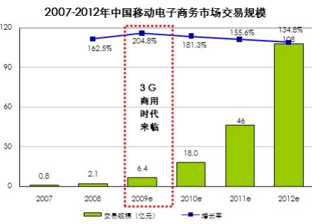 根據(jù)艾瑞咨詢即將發(fā)布的《2008-2009年中國(guó)移動(dòng)電子商務(wù)行業(yè)發(fā)展報(bào)告》數(shù)據(jù)表明,08年中國(guó)移動(dòng)電子商務(wù)市場(chǎng)交易規(guī)模為2.1億元,09年隨著3G商用時(shí)代到來,以及無線與傳統(tǒng)電子商務(wù)企業(yè)的紛紛試水,預(yù)計(jì)交易規(guī)模將達(dá)6.4億,同比增長(zhǎng)約205%。艾瑞預(yù)計(jì)2012年移動(dòng)電子商務(wù)交易規(guī)模將達(dá)到108億元,發(fā)展?jié)摿薮蟆?br />