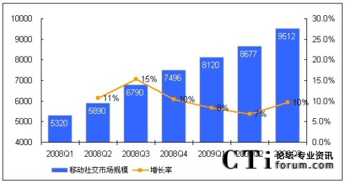 CTI論壇(ctiforum)12月8日消息(記者 楊悅):馳昂咨詢(Sinotes)發(fā)布的《2009年中國移動互聯(lián)網(wǎng)業(yè)務市場監(jiān)測-第三季度》報告數(shù)據(jù)顯示,2009年Q3中國移動社交業(yè)務市場規(guī)模才超過9000萬元,達9512萬元,直逼億元大關(guān)。與2009年Q2相比,增長率達10%。預計其年增長率將超過30%。