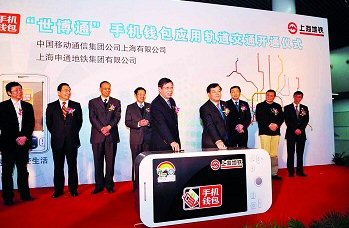 圖:為上海市常務(wù)副市長(zhǎng)楊雄、中國(guó)移動(dòng)副總裁李正茂共同啟動(dòng)“世博通”手機(jī)錢包軌道交通應(yīng)用。