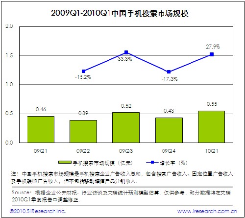 2010Q1中國手機搜索市場規(guī)模為5500萬,環(huán)比增長27.9%,手機搜索請求量和PV的大幅增長帶動廣告收入增加。自2009年下半年以來,受手機上網(wǎng)用戶規(guī)模迅速發(fā)展以及用戶活躍度和黏性顯著增加的影響,手機搜索市場進入快速發(fā)展階段。與此同時,手機搜索企業(yè)紛紛加大市場投入力度,建立與電信運營商和手機終端廠商的深度合作關系是業(yè)務拓展的重點方向。此外,網(wǎng)頁產(chǎn)品和客戶端軟件深度整合也是手機搜索企業(yè)布局移動互聯(lián)網(wǎng)市場的最佳實踐。受谷歌事件影響,艾瑞預計2010Q2手機搜索市場集中度將進一步提高。