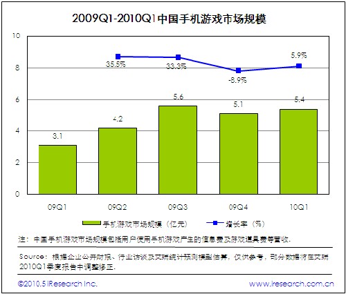 2010Q1中國手機游戲市場規(guī)模為5.4億,環(huán)比增長5.9%.2009年底電信運營商調(diào)整業(yè)務合作伙伴計費政策,導致WAP和G+手機游戲平臺等特定計費平臺暫時停止計費,對手機游戲市場營收增長產(chǎn)生不利影響。除了季節(jié)因素以外,手機單機游戲受電信運營商暫停WAP計費影響較大,手機網(wǎng)游受政策影響有限。盡管本季度手機游戲市場扭轉(zhuǎn)營收規(guī)模下滑的不利局面,重新恢復增長態(tài)勢,但是手機游戲?qū)﹄娦胚\營商計費通道的高依存度,決定行業(yè)受政策風險的影響較大。實現(xiàn)營收多元化是手機游戲業(yè)界思考和關注的問題。
