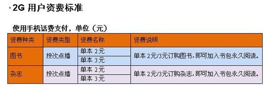 據(jù)了解,中國聯(lián)通手機閱讀業(yè)務(wù)只針對聯(lián)通網(wǎng)內(nèi)手機用戶,采用按次點播(按本訂購)的資費標(biāo)準(zhǔn)。同時,2G用戶和3G用戶采用不同的支付方式,2G用戶使用手機話費支付,3G用戶使用M/T支付。