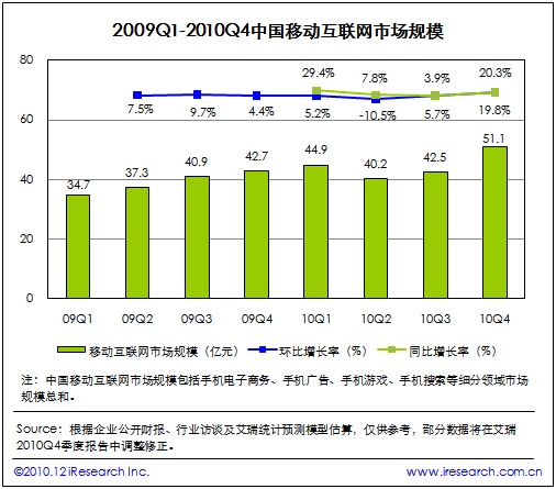 2010Q4中國(guó)移動(dòng)互聯(lián)網(wǎng)市場(chǎng)整體規(guī)模達(dá)到51.1億,同比增長(zhǎng)19.8%,環(huán)比增長(zhǎng)20.3%。艾瑞分析認(rèn)為,本季度電信管理局等政府行業(yè)管理部門和電信運(yùn)營(yíng)商對(duì)移動(dòng)增值市場(chǎng)治理行動(dòng)基本結(jié)束,移動(dòng)增值市場(chǎng)整體回升。同時(shí)手機(jī)電子商務(wù)市場(chǎng)繼續(xù)保持快速增長(zhǎng),移動(dòng)互聯(lián)網(wǎng)市場(chǎng)規(guī)?傮w回升。