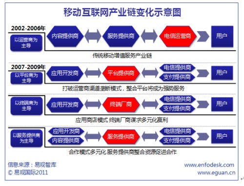 Enfodesk易觀智庫在近期發(fā)布的研究成果中對于移動互聯網深入的研究,易觀國際在這一報告中認為,移動互聯網開發(fā)的格局促使電信運營商在產業(yè)鏈中逐漸失去主導性。