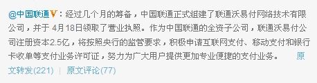 而中國(guó)聯(lián)通昨日宣布,中國(guó)聯(lián)通正式組建了聯(lián)通沃易付網(wǎng)絡(luò)技術(shù)有限公司,并于 4月18日領(lǐng)取了營(yíng)業(yè)執(zhí)照。