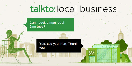 這一切是怎樣實現(xiàn)的呢?TalkTo通過短信與商家溝通。用戶可以通過web應(yīng)用在TalkTo目錄中搜索需要的服務(wù),輸入商家的詳細地址或者大概位置,TalkTo就可以確保商家看到用戶的短信。TalkTo用戶可以向商家提出問題和意見,或直接預(yù)定服務(wù)!斑@一切就像和朋友發(fā)短信一樣簡單。”