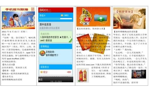 作為快消業(yè)的巨頭,康師傅一直不遺余力地探索新型營(yíng)銷方式,旨在拋棄以往單向、刻板的傳播思路,帶給消費(fèi)者全新的品牌體驗(yàn),“傳世新飲”作為康師傅創(chuàng)新?tīng)I(yíng)銷方式代表者,定位于中華傳統(tǒng)飲品,希望把中國(guó)傳統(tǒng)飲料發(fā)揚(yáng)光大,所以其理想的消費(fèi)群體是20—29歲地年輕人群,而手機(jī)是這部分人接收信息、互動(dòng)娛樂(lè)的重要渠道,開(kāi)展移動(dòng)營(yíng)銷也是據(jù)此作出的選擇。在與國(guó)內(nèi)領(lǐng)先的全方案移動(dòng)營(yíng)銷服務(wù)提供商百分通聯(lián)的合作中,康師傅一改單純的促銷形式,選擇了近來(lái)深受學(xué)生歡迎的手機(jī)位置化簽到和APP互動(dòng)小游戲進(jìn)行整合,并打通了微博、論壇、彩信手機(jī)報(bào)刊廣告、彩信等進(jìn)行立體化傳播,從而發(fā)揮出驚人的傳播能力。