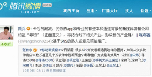 在騰訊科技微博特色欄目“鏘鏘五人行”的熱議中,中日3G應(yīng)用研究院執(zhí)行院長顏兵表示:“未來,優(yōu)秀的APP和專業(yè)的有資本和通道背景的新媒體營銷公司相互尋租,再結(jié)合線下相關(guān)產(chǎn)業(yè),形成新的產(chǎn)業(yè)鏈。”