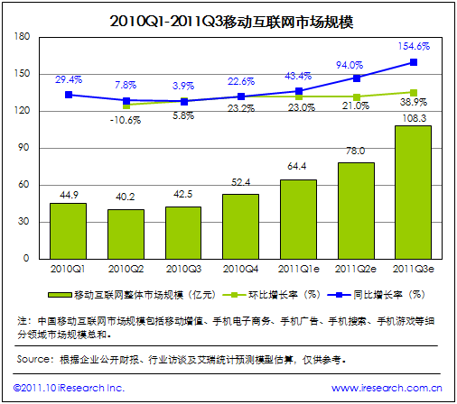 2011Q3中國(guó)移動(dòng)互聯(lián)網(wǎng)市場(chǎng)規(guī)模達(dá)108.3億元