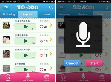 Talk Jokes是一款輕量級(jí)語(yǔ)音笑話分享應(yīng)用,鼓勵(lì)用戶(hù)通過(guò)真人錄音的方式上傳和分享自己的笑話,專(zhuān)注于“講笑話”的這部分語(yǔ)音垂直市場(chǎng)。