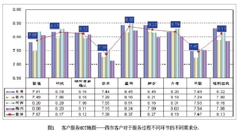 客戶服務(wù)MOT地圖(圖1)——該模塊通過(guò)對(duì)10086熱線服務(wù)過(guò)程的全景式展示,直觀表現(xiàn)不同地區(qū)、不同品牌客戶在10086熱線服務(wù)不同環(huán)節(jié)上的核心需求,話務(wù)員通過(guò)本模塊,可以迅速把握10086熱線服務(wù)的要點(diǎn);