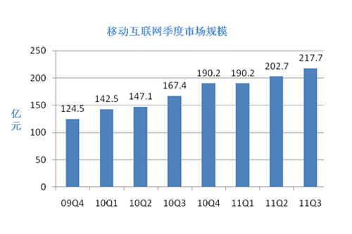 上圖是易觀國際發(fā)布的移動互聯(lián)網(wǎng)的相關(guān)數(shù)據(jù),數(shù)據(jù)截止到2011年第三季度,該圖顯示,2009年全球經(jīng)濟復(fù)蘇之后,移動互聯(lián)網(wǎng)業(yè)務(wù)收入一直保持著良好的增長狀態(tài),最新數(shù)據(jù)表明,2011年移動互聯(lián)網(wǎng)的整體市場規(guī)模已達到851億,遠(yuǎn)超過2010年的637億,增長率將近33.6%,在移動互聯(lián)網(wǎng)業(yè)務(wù)子領(lǐng)域中,表現(xiàn)最突出的是移動電子商務(wù),與2009年相比較,移動電子商務(wù)所占比例由3%直線增長到11%。但是在手機閱讀和手機游戲方面則表現(xiàn)平平,有較大的增長空間。預(yù)計2012年3G用戶規(guī)模將增長到6億,將會超過互聯(lián)網(wǎng)用戶數(shù)量,智能機以及移動互聯(lián)網(wǎng)還會保持或者超過2011年的增長速率。