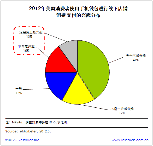 iResearch艾瑞咨詢整理eMarketer調查數(shù)據發(fā)現(xiàn),盡管手機支付市場增速迅猛,但其在美國消費者中的接受程度相對較低。數(shù)據顯示,被調查者中只有1/4的美國用戶對使用手機錢包在線下店鋪消費感興趣,而相比之下,58%的消費者對手機錢包技術不感興趣,其中包括41%的人完全沒興趣。