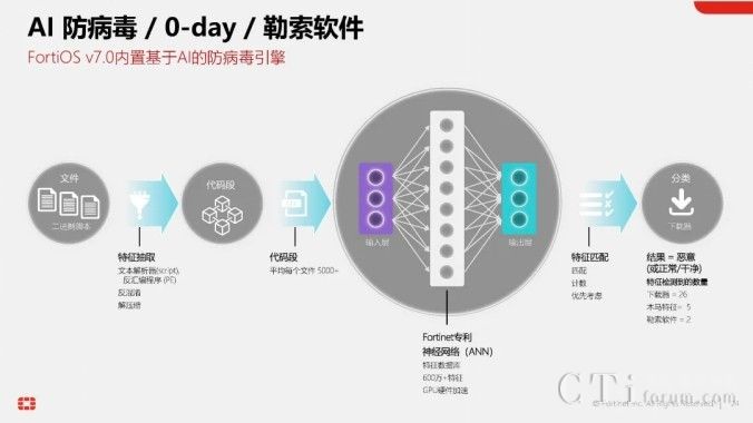 目前,AI技術(shù)已深度融入Fortinet的數(shù)十種產(chǎn)品與方案中。在最新版的統(tǒng)一網(wǎng)絡(luò)安全操作系統(tǒng)FortiOS 7.6中,就已經(jīng)內(nèi)置了由FortiGuard AI實(shí)驗(yàn)室研發(fā)的基于AI的防病毒引擎。該引擎運(yùn)用神經(jīng)網(wǎng)絡(luò)技術(shù),學(xué)習(xí)并區(qū)分海量病毒文件與正常文件,通過(guò)分類(lèi)打分的方式,實(shí)現(xiàn)對(duì)未知文件與病毒的精準(zhǔn)判斷,無(wú)需依賴傳統(tǒng)的病毒特征庫(kù)。因此,F(xiàn)ortinet的FortiGate等產(chǎn)品在防病毒方面擁有雙引擎加持,既有傳統(tǒng)的基于病毒特征庫(kù)的防病毒引擎,又有基于AI的下一代防病毒引擎(Anti-virus NGAV),雙重保障,安全無(wú)憂。