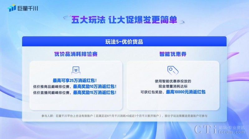 四、「重點(diǎn)產(chǎn)品玩法」:「全域推廣」和「新品起量」兩個(gè)巨量千川平臺(tái)重點(diǎn)產(chǎn)品,也推出了系列玩法。全域推廣對(duì)新客、完成有效測(cè)試的客戶發(fā)放全域推廣專屬紅包,最高達(dá)28888元,參與全域增長消耗排位賽也可獲得高達(dá)50000元的消返紅包。新品起量基準(zhǔn)期新客現(xiàn)金消耗≥300元,可獲得100元消返紅包獎(jiǎng)勵(lì),老客現(xiàn)金消耗≥500元,即可得到100元消返紅包獎(jiǎng)勵(lì)。