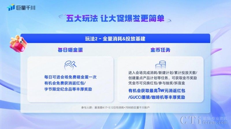 二、「每日砸金蛋&金幣任務(wù)」:針對(duì)在618好物節(jié)期間現(xiàn)金消耗對(duì)比基準(zhǔn)期消耗增長率未達(dá)標(biāo)的商家,可參與每日砸金蛋和金幣任務(wù)。商家每日可進(jìn)入會(huì)場(chǎng)免費(fèi)砸金蛋一次,就有機(jī)會(huì)免費(fèi)獲得消返紅包和字節(jié)限定紀(jì)念品等獎(jiǎng)勵(lì)。此外,商家進(jìn)入會(huì)場(chǎng)完成消耗/新建計(jì)劃/累計(jì)投放天數(shù)/創(chuàng)建重點(diǎn)產(chǎn)品計(jì)劃等任務(wù),可獲取金幣獎(jiǎng)勵(lì),憑金幣可兌換紅包、參與抽獎(jiǎng)和拆盲盒等豐厚獎(jiǎng)勵(lì),最高可得10000元消返紅包。