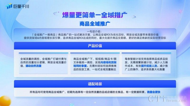 此外,商品全域推廣為商品推廣提供一站式解決方案,是以商品全域ROI為優(yōu)化目標(biāo),釋放全域流量帶來的增效價(jià)值,提供貨架場(chǎng)、內(nèi)容場(chǎng)增長雙引擎,幫助客戶在追求商品全域ROI達(dá)成的同時(shí),最大化提升商品交易額,更好的滿足客戶的實(shí)際經(jīng)營目標(biāo)。在商品全域推廣下,短視頻/商品卡/圖文體裁統(tǒng)一調(diào)控,無需糾結(jié)選擇推廣商品的投放工具,一站式全域流量觸達(dá)。