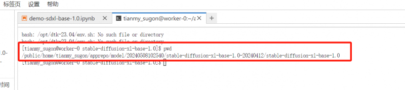 第二步,在終端頁面輸入“pwd”,查看并復(fù)制 stable-diffusion-xl-base-1.0 模型路徑。