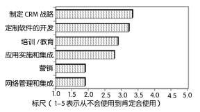 通常,通信提供商相對而言不愿意求助于專業(yè)服務(wù)公司來幫助其實施CRM解決方案。在1~5的標尺中,只有積分為5的公司可能使用專業(yè)服務(wù)公司,分數(shù)低于3.5的公司沒有一家會這么做,這表明通信提供商仍由內(nèi)部人員來實施多數(shù)功能。調(diào)查的分數(shù)表明他們最可能與外部服務(wù)提供商合作制定戰(zhàn)略——定制軟件開發(fā)(3.33)和培訓(xùn)(3.22)。他們最不可能求助此類公司來從事網(wǎng)絡(luò)管理和集成(1.89)或營銷(1.89)工作。圖3顯示的就是這些調(diào)查結(jié)果。