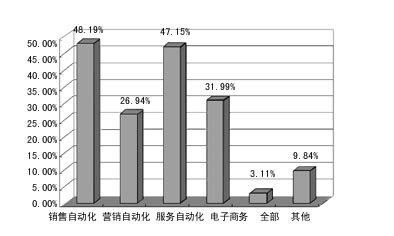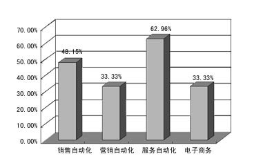 在已實(shí)施CRM企業(yè)的情況中,實(shí)施模塊最多的是服務(wù)自動化,其次是銷售自動化;但那些沒用CRM的企業(yè),準(zhǔn)備先上銷售自動化模塊的企業(yè)最多,而服務(wù)自動化其次。對于CRM軟件市場來說,銷售自動化和服務(wù)自動化仍是主流。