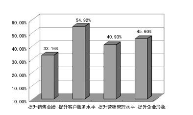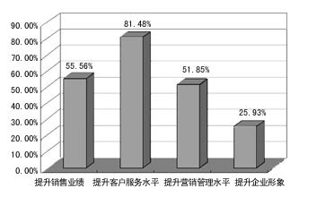 從結(jié)果上看,企業(yè)實(shí)施的最大動力是“提升客戶服務(wù)水平”。這說明,企業(yè)對CRM的理解還僅僅停留在初級階段,尚沒有充分認(rèn)識到對企業(yè)提升銷售業(yè)績、營銷管理水平有著重要作用。這其實(shí)也反應(yīng)了我國企業(yè)目前的管理水平。