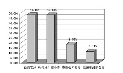 在用戶如何實(shí)施CRM系統(tǒng)的調(diào)查中,已應(yīng)用CRM的單位一般都是由自己或軟件提供商負(fù)責(zé),而沒用CRM的企業(yè)則大多期望能由軟件提供商負(fù)責(zé)。這說明,用戶實(shí)施CRM的主體意識還不夠強(qiáng)。