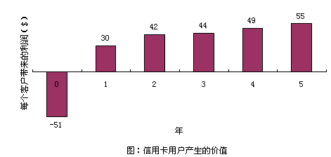 以信用卡服務為例,爭取一個新的用戶平均要51美圓,用于廣告、推銷和開戶等開支。用戶開始時花錢很少,但為公司帶來一定的利潤。但如果用戶繼續(xù)使用到第二年,就會為公司帶來更多的經(jīng)濟效益,因為公司與客戶之間的信任和客戶對公司的滿意,致使客戶更多地通過信用卡消費。(圖:"信用卡用戶產(chǎn)生的價值")用戶貢獻在增加,公司的運作費用卻在不斷減低。信用卡公司可以不斷減少對客戶信用的審核時間。保持長期的客戶關系,還可以減少廣告支出,客戶本身就是一個免費的廣告資源。很多人在消費前喜歡聽取朋友的意見,覺得比廣告更可信。