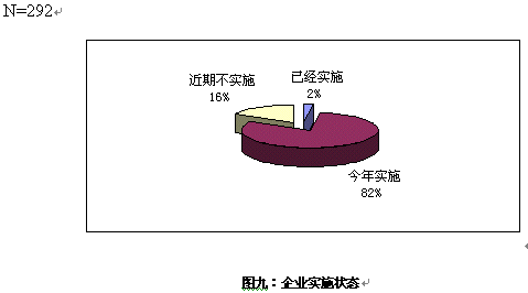 對(duì)大多數(shù)企業(yè)來說,對(duì)CRM還處于關(guān)注階段,只有7家企業(yè)表示已經(jīng)開始實(shí)施,在的電話訪問中,了解到這7家企業(yè)的實(shí)施的主要是在渠道管理和客戶呼叫中心等方面,但表示今年會(huì)開始實(shí)施的卻超過8成。