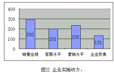 (d)提升企業(yè)形象:很多受訪企業(yè)特別是服務(wù)業(yè),已經(jīng)建立客戶忠誠(chéng)度放在了很重要的位置,但比較其它幾個(gè)直接動(dòng)因,比例偏低,這也似乎說明"以客戶為中心"的觀念還沒有"以利潤(rùn)為中心"強(qiáng)烈。
