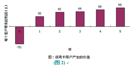 以信用卡服務(wù)為例,爭(zhēng)取一個(gè)新的用戶平均要51美圓,用于廣告、推銷和開戶等開支。用戶開始時(shí)花錢很少,但為公司帶來一定的利潤(rùn)。但如果用戶繼續(xù)使用到第二年,就會(huì)為公司帶來更多的經(jīng)濟(jì)效益,因?yàn)楣九c客戶之間的信任和客戶對(duì)公司的滿意,致使客戶更多地通過信用卡消費(fèi)。(圖:"信用卡用戶產(chǎn)生的價(jià)值")用戶貢獻(xiàn)在增加,公司的運(yùn)作費(fèi)用卻在不斷減低。信用卡公司可以不斷減少對(duì)客戶信用的審核時(shí)間。保持長(zhǎng)期的客戶關(guān)系,還可以減少?gòu)V告支出,客戶本身就是一個(gè)免費(fèi)的廣告資源。很多人在消費(fèi)前喜歡聽取朋友的意見,覺得比廣告更可信。