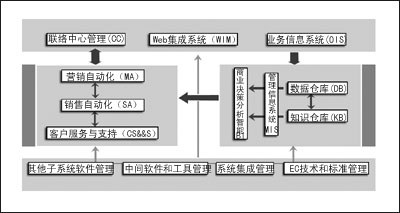 在信息技術(shù)管理子系統(tǒng)中,CRM的各功能模塊和相關(guān)系統(tǒng)運(yùn)行都必須由先進(jìn)的技術(shù)、設(shè)備、軟件來(lái)保障,主要的內(nèi)容可以分為以下四類:其他子系統(tǒng)應(yīng)用軟件管理,如數(shù)據(jù)庫(kù)管理系統(tǒng)、電子軟件分發(fā)系統(tǒng)等;中間軟件和系統(tǒng)工具的管理,如中間軟件系統(tǒng)、系統(tǒng)執(zhí)行管理工具等;企業(yè)級(jí)系統(tǒng)的集成管理,如CRM與企業(yè)管理信息系統(tǒng)的集成,乃至整個(gè)的企業(yè)應(yīng)用集成方案,以實(shí)現(xiàn)將企業(yè)的CRM與ERP、SCM等系統(tǒng)緊密集成;電子商務(wù)技術(shù)和標(biāo)準(zhǔn)的管理,如Internet技術(shù)、EDI技術(shù)及標(biāo)準(zhǔn)、通信標(biāo)準(zhǔn)的管理等。為支持無(wú)線應(yīng)用,CRM技術(shù)管理子系統(tǒng)將提供與手機(jī)、PDA、智能家電等工具的通訊接口,采用J2EE或.NET技術(shù)平臺(tái),以及在支持無(wú)線傳輸和無(wú)線LAN應(yīng)用等方面進(jìn)行相應(yīng)的調(diào)整。