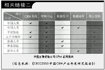 據(jù)某IT媒體2002年末的調(diào)研,只有不到1/5的中國(guó)保險(xiǎn)公司擁有客戶(hù)關(guān)系管理系統(tǒng),但是近六成的保險(xiǎn)公司計(jì)劃在近期內(nèi)實(shí)施CRM;另一份調(diào)查則顯示中國(guó)保險(xiǎn)業(yè)過(guò)去3年的IT投入平均達(dá)到9.36億元,幾乎所有的保險(xiǎn)公司都在從不同側(cè)面開(kāi)展CRM建設(shè)。CRM在中國(guó)保險(xiǎn)業(yè)的應(yīng)用,到底是處于落伍還是冒進(jìn)狀態(tài),成為一個(gè)意味深長(zhǎng)的話題。