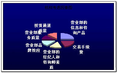 。。具筆者調(diào)查,現(xiàn)在對營業(yè)部盈利最大的是機(jī)構(gòu)客戶或者大額個人投資者,而隨著股市行情的低彌,他們在選取營業(yè)部的考慮因素主要關(guān)鍵點及其所占比例如下圖: