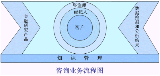 如上圖所示的證券經(jīng)紀行業(yè)的投資咨詢服務業(yè)務流程,是在整體的知識管理的平臺之上,根據(jù)金融產(chǎn)品的信息通道和數(shù)據(jù)分析和挖掘的基礎,由咨詢師和經(jīng)紀人組成可行性的個性化服務小組為核心客戶提供真正的"一對一"投資設計和投資咨詢服務。