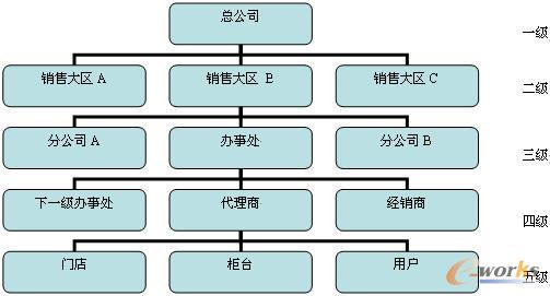 目前國內企業(yè)分銷網絡層次最多可達到五層,如圖1所示。最上層是營銷總部,第二層是銷售大區(qū),第三層是各地分公司、辦事處,第四層是各地辦事處、代理商和經銷商,第五層是用戶或門店。
