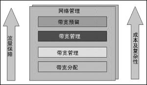 如圖所示,網(wǎng)絡管理貫穿于四個模塊建立過程中。特定的組件應針對網(wǎng)絡基礎設施的特定部分而實施。具體實施時,應首先從帶寬分配模塊開始,然后逐個上移。實施的模塊越多,保證的品質(zhì)會越高,但同時也增加了管理的復雜性,加大了維護成本。