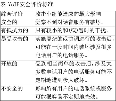 測(cè)試結(jié)果表明,采用了復(fù)雜攻擊手段的攻擊小組無法破壞思科公司的VoIP網(wǎng)絡(luò),甚至無法對(duì)其造成顯著的干擾。這套精心制造的IP電話系統(tǒng)(包括第二層和第三層基礎(chǔ)設(shè)施以及各式各樣的附加安全軟件)是“安全的”(參見表中所示的VoIP安全評(píng)價(jià)標(biāo)準(zhǔn)),它最大限度地全面發(fā)揮了思科公司的網(wǎng)絡(luò)安全專長(zhǎng),利用了思科公司擁有的每一種防御武器。