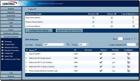 SonicWALL入侵檢測服務(wù)(IPS)能夠為VoIP協(xié)議應(yīng)用層提供全面保護。IPS集成了一個可配置的超高性能掃描引擎,配合動態(tài)更新和擁有1900多攻擊和漏洞簽名的數(shù)據(jù)庫,可以保護網(wǎng)絡(luò)免受最復(fù)雜的木馬和變形威脅的影響。SonicWALL已經(jīng)利用一系列VoIP相關(guān)的簽名來擴展其IPS簽名數(shù)據(jù)包,可以防止惡意業(yè)務(wù)流到達(dá)受保護的VoIP電話和服務(wù)器。