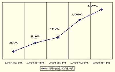 很快時代華納有線的VoIP業(yè)務就出現(xiàn)了強勁的增長,2005年的頭幾個月,其VoIP用戶數(shù)以幾乎每周1萬的速度增加,到2005年第二季度,時代華納有線就成為全美第二大VoIP提供商。圖1描述了時代華納有線從2004年到2006年初的VoIP客戶強勁增長。