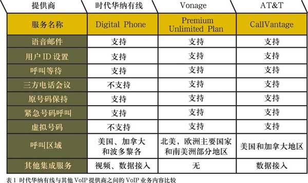 “數(shù)字電話”的用戶在交納包月費用后就可以無限制地呼叫北美地區(qū)的電話,同時享受各種標準的電話服務和呼叫緊急號碼,例如411服務和911緊急呼叫。而作為網(wǎng)絡電話,“數(shù)字電話”還為用戶提供很多具有網(wǎng)絡特征的功能,諸如來電顯示、號碼速撥、匿名呼叫控制、語音郵件等。此外時代華納有線正在計劃利用有線電視接入提供更多的集成服務,例如用體育、天氣或者新聞消息替代標準的撥號音供用戶使用。