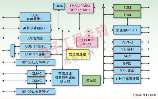 德州儀器(TI)公司最新的VoIP處理器設(shè)計(jì)用于確保在中小企業(yè)應(yīng)用中提供無延遲的語音服務(wù)。這種名為TNETV1051的處理器集成了1個300MHz的MIPS處理器、1個150MHz的C55x數(shù)字信號處理器(DSP)、2個千兆位以太網(wǎng)(GbE)媒體訪問控制器(MAC),以及1個片內(nèi)GbE交換器。