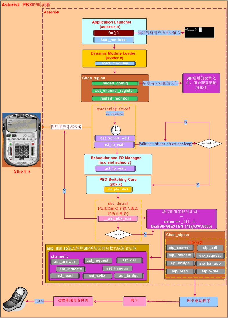 Asterisk具有傳統(tǒng)PBX無法比擬的優(yōu)點,那就是其靈活性,可擴(kuò)展能力;Asterisk的擴(kuò)展能力是通過開放相應(yīng)的架構(gòu)和接口來實現(xiàn)的。這就意味著Asterisk是一個組件而不是一個成型的產(chǎn)品,Asterisk的核心提供了一個基本的可運行環(huán)境,而外圍相應(yīng)的能力則可以通過加載和配置相關(guān)的插件和模塊來實現(xiàn)。
