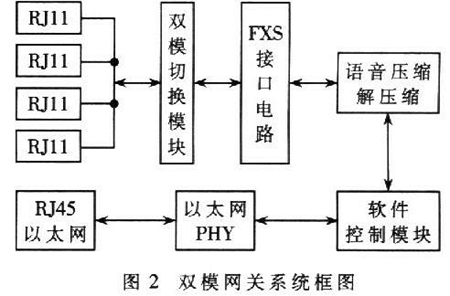 網關在VoIP網絡中主要起協(xié)議轉換、控制及關守作用,如呼叫控制和呼叫管理等。雙模網關在普通VoIP網關的基礎上增加了VoIP與PSTN之間的切換。雙模網關系統(tǒng)從功能上可分為雙模切換模塊、FXS接口電路模塊、語音處理模塊和軟件控制模塊,其系統(tǒng)框圖如圖2所示。