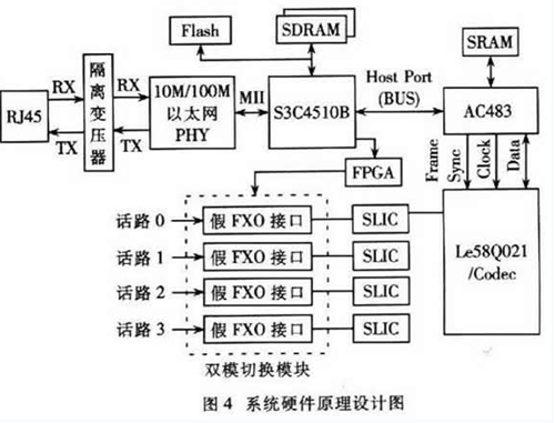 本節(jié)提出了一種基于H.323的雙模網關的系統(tǒng)設計方案,該方案支持4路話音,使用一種經濟實用的“假FXO接口”方式實現(xiàn)雙模切換,能夠在VoIP通話時檢測到PSTN線上進來的呼叫并可通過按話機的拍簧或者Flash閃斷鍵切換接聽!