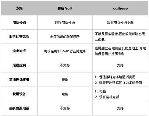 可以看到,callfreee方案主要在服務(wù)的成本與穩(wěn)定性、保留原來(lái)電話號(hào)碼以及多種設(shè)備的應(yīng)用等方面有了改變,并且?guī)缀醵际轻槍?duì)傳統(tǒng)VoIP的不足來(lái)進(jìn)行的完善。對(duì)于這些不同,我們不妨以表格的形式來(lái)表現(xiàn),這樣更加一目了然。