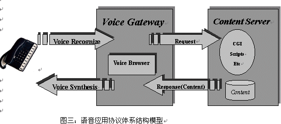 語音應(yīng)用協(xié)議(VAP VA)定義了終端--?網(wǎng)關(guān)--?服務(wù)器的體系結(jié)構(gòu)。語音服務(wù)器(Voice Server )是語音應(yīng)用的服務(wù)器,其包含語音應(yīng)用和數(shù)據(jù)、內(nèi)容;與WAP體系結(jié)構(gòu)不同的是,語音網(wǎng)關(guān)(Voice Gateway) 做為終端和語音應(yīng)用服務(wù)器的橋梁,作為語音應(yīng)用協(xié)議中的重要部分:語音瀏覽器(Voice Browser)建于語音網(wǎng)關(guān)(Voice Gateway)內(nèi),而不象WAP協(xié)議中,micro browser 建于終端中。這是因?yàn)檎Z音終端過于簡(jiǎn)單以及語音數(shù)據(jù)可以通過電信網(wǎng)絡(luò)輕松與語音網(wǎng)關(guān)(Voice Gateway)交互。