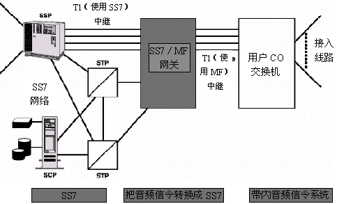 如圖14所示,SS7/MF網(wǎng)關可以實現(xiàn)SS7信令到MF(多頻)信令的轉換,使現(xiàn)有MF信令交換機無須升級就能擁有SS7信令能力;旌狭薙S7和基于音頻信令的呼叫建立環(huán)境能為各種運營商經(jīng)濟實用的SS7網(wǎng)絡接入方案,采用這一方案的有蜂窩電話運營商、本地電話運營商、長途電話運營商和其它一些仍使用舊式交換機的電話運營商。
